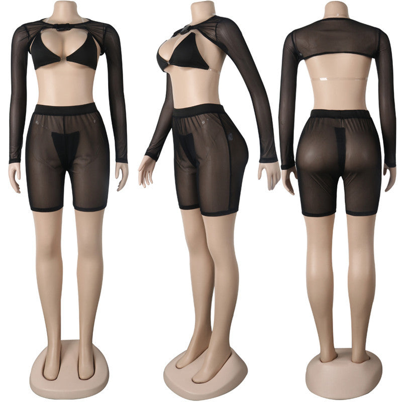Long Sleeve Mesh 4 Piece Swimsuit Set